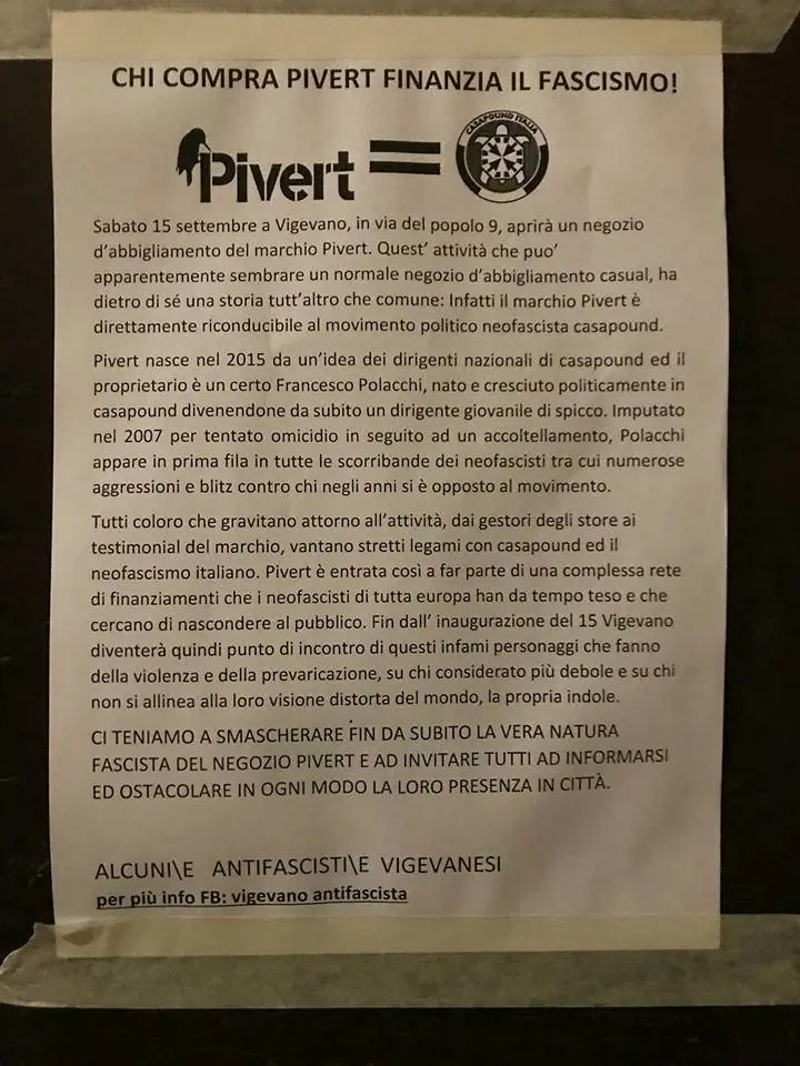 Questa volta Francesco Polacchi – titolare, appunto, del brand – è finito nel mirino del gruppo Vigevano Antifascista, che protesta contro l’apertura in via del popolo di uno store del brand. Nella cittadina lombarda c’è fermento e – come scrive La Provincia Pavese – sono comparsi numerosi volantini contrari alla novità commerciale che recitano così: "Quel negozio finanzia il fascismo, non lo vogliamo nella nostra città. Pivert è direttamente riconducibile al movimento politico neofascista Casapound".