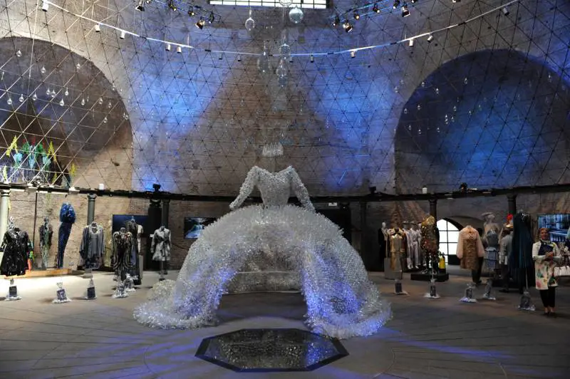 Al centro della sala circolare del frigidarium, sotto gocce di vetro soffiato di Ilaria Sadun e tra effetti speciali luminosi, accoglie i visitatori la «Regina dell'Acqua», enorme istallazione ecosostenibile di Enrica Borghi che ha creato con 20 mila bottiglie di plastica un trasparente abito da ballo dalla gonna che si allarga come un igloo, pronto ad ospitare, abbracciare, conquistare.