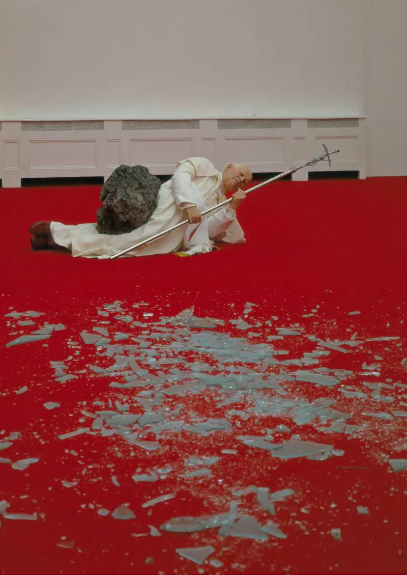 Dalla Nona Ora al "dito medio" La nona Ora rappresenta il pontefice Giovanni Paolo II colpito dal peso di un meteorite che è il simbolo dei mali terreni che non risparmiano nemmeno una delle massime autorità spirituali. Il Papa, però, non soccombe sotto il peso del meteorite, ma si aggrappa al crocefisso e a Cristo in segno di speranza che salva. Durante il giorno nella prestigiosa sala di Palazzo Reale proseguiranno i lavori di restauro che riporteranno le Cariatidi all’antico splendore. La sera, invece, magicamente lo spazio si trasformerà e si animerà con Maurizio Cattelan. In Piazza Affari sarà collocata, dal 24 settembre al 3 di ottobre, L.O.V.E., una scultura in marmo di Carrara di 11 metri creata appositamente per Milano. L’opera raffigura un’enorme mano con tutte le dita mozzate, tranne il dito medio. Quest’opera evoca il saluto nazista come gesto paradigmatico degli orrori e degli errori del secolo scorso.
