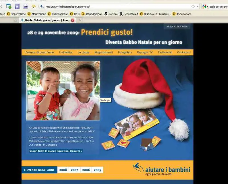 "Prendici gusto, diventa anche tu Babbo Natale per un giorno!”. E’ questo l’invito della Fondazione "aiutare i bambini" per la quinta edizione di "Babbo Natale per un giorno", l’evento nazionale di piazza che permette a tutti di "diventare Babbo Natale", aiutando concretamente i bambini. Per accogliere l’appello della Fondazione basta recarsi sabato 28 e domenica 29 novembre in uno degli oltre 250 banchetti allestiti nelle principali piazze italiane (per conoscerle: www.aiutareibambini.it) e fare una piccola donazione: in segno di ringraziamento i volontari di "aiutare i bambini" daranno in dono un simpatico cappello di Babbo Natale - simbolo dell’iniziativa - o una confezione di cioccolatini.