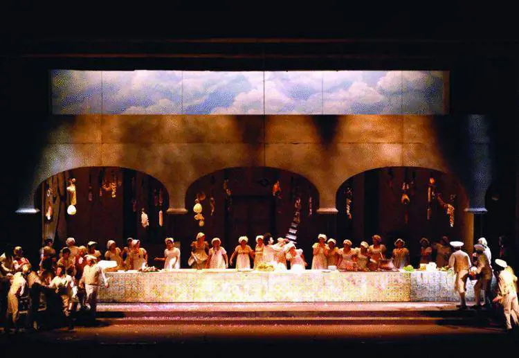 Splendida la scena della cucina - in cui il coro fra l'altro ha dato buona prova - tripudio di pentoloni fumanti e pingui insaccati, molto efficace nel contrasto con il mondo borghese a cui saldamente cerca di ancorarsi Don Pasquale, fatto di busti e anticaglie polverose. Premio alla regia, allora, e a quell'aspetto d'insieme che fa dell'opera di Donizetti un perfetto meccanismo, un capolavoro di complicità tra musica ed elemento drammaturgico: bene il lavoro di squadra dei personaggi, che nel complesso hanno costruito con efficacia il gioco delle parti, nonostante qualche «inceppamento» dell'ingranaggio, come nel duetto basso-baritono dell'ultimo atto, con lo sfasamento tra tempo dei cantanti e quello dell'orchestra.