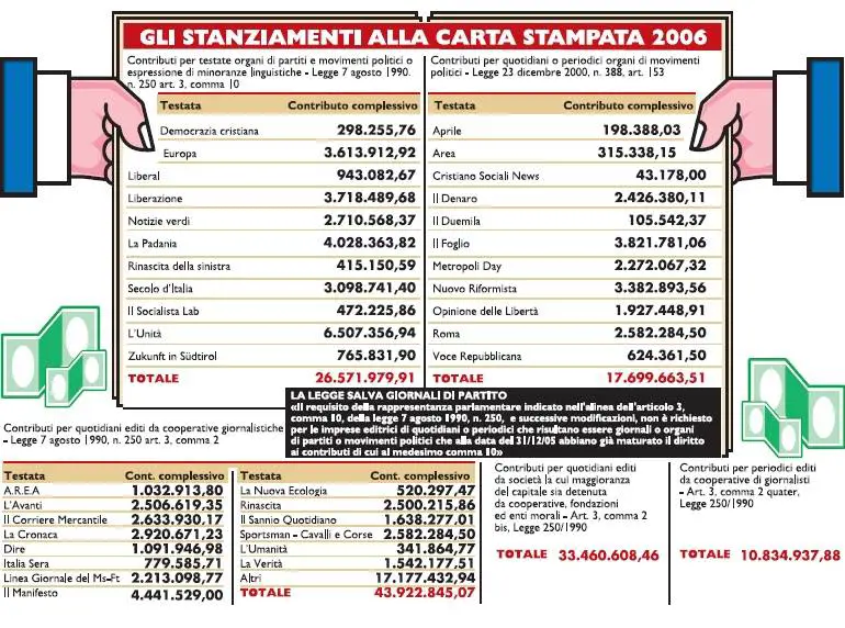L’ultimo aggiornamento fornito dal dipartimento per l’editoria della presidenza del Consiglio informa che ai giornali di partito sono stati concessi (per l’anno 2006) 26 milioni 571mila euro. Nell’elenco non sono ancora compresi alcuni quotidiani di cui si sta concludendo l’istruttoria. Per conoscere l’entità dei contributi del 2007 bisognerà attendere la fine del 2008, ma a quanto si apprende i versamenti saranno pressoché identici all’anno passato.