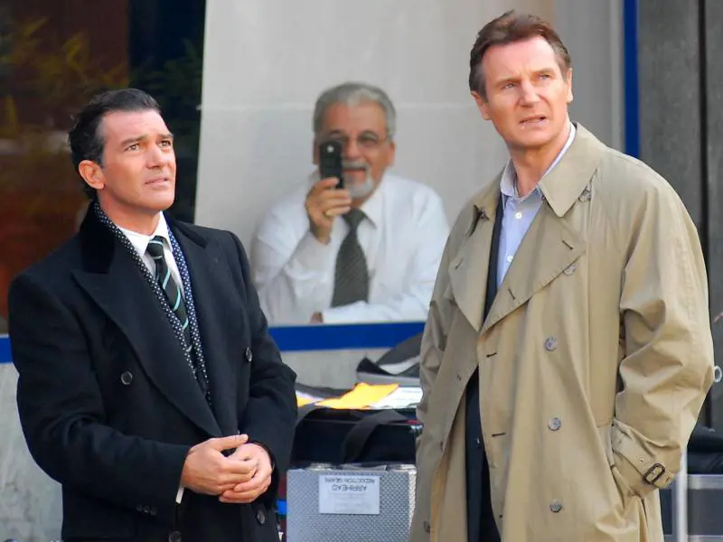 Banderas a spasso per Milano: folla sul set di "The other man". L'attore sta girando con Liam Neeson e Laura Linney un thriller romantico sul lago di Como