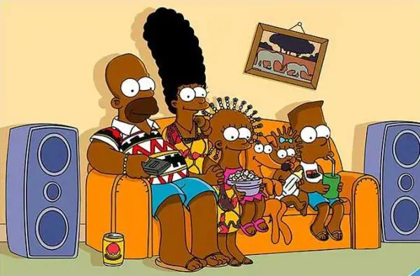 La trasformazione culturale Non ci è dato di sapere tanto. Marge non perderà certamente la folta chioma all'ìnsù che nemmeno lo stress di una famiglia tanto disastrata è riuscito a indebolire e sfibrare. Non sarà blu, ma avrà folti ricci afro. A Lisa e Meggie, invece, la testa appuntita lascerà il posto alle treccine. Niente paura per la pelata di Homer: così è, così resterà. Impossibile immaginarselo diverso: la pelata, la panza ingombrante, gli occhi veloci e talvolta vitrei e quel sorriso che promette il bene in ogni situazione (anche in quelle più avverse). Smessi i vestiti anonimi la famiglia Simpson indosserà abiti con le greche e i disegni tipici della tradizione africana. E ai piedi? Semplici ciabattine.