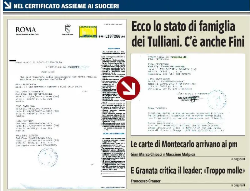 L’abitazione di riferimento è l’appartamento romano di via Raffaele Conforti nel quartiere periferico di Val Cannuta,tra l’altro uno degli immobili che l’ex patron del Perugia calcio Luciano Gaucci reclama a sé dopo la «cessione»all’ex fidanzata Elisabetta. L’elenco dei componenti dello stato di famiglia riporta i nomi, date di nascita e codici fiscali nell’ordine di:«Tulliani Elisabetta », 38 anni, l’attuale compagna di Fini. Quindi le figlie avute dalla relazione con il presidente della Camera e che portano difatti il cognome di quest’ultimo:Carolina e Martina Fini, due anni e mezzo la prima, un anno a ottobre la seconda. Infine c’è Sergio Tulliani, marito di Francesca Frau e padre di Elisabetta: 67 anni, funzionario dell’Enel in pensione. Manca Giancarlo, ma si sa, lui risulta residente nel Principato.