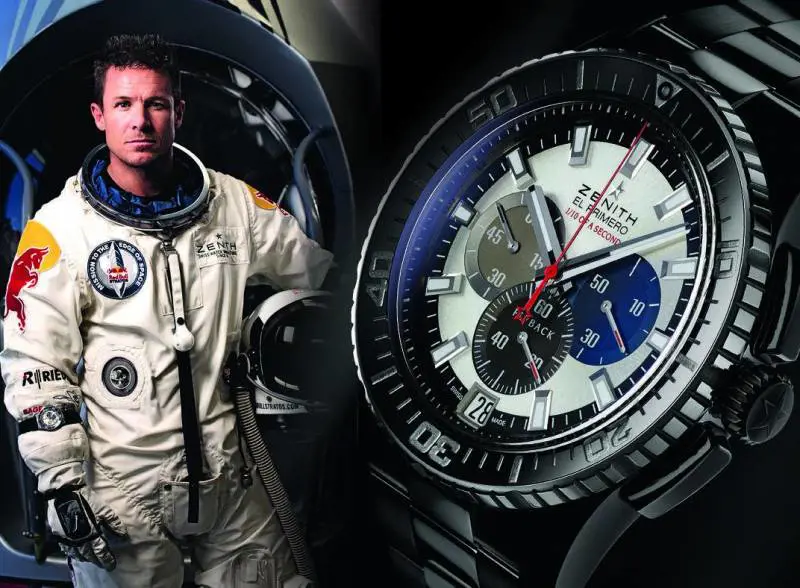 A quel punto, dopo aver fatto il saluto militare, è saltato. Durante la caduta libera ha raggiunto la velocità massima di 1.342,8 Km/h, infrangendo, primo uomo al mondo, la barriera del suono (dai 1.193 Km/h ai 1.236 Km/h). Ambasciatore di Zenith, che ha sostenuto l'impresa coordinata da Red Bull, nel corso dell'incredibile volo al suo polso aveva il cronografo El Primero Stratos Flyback Striking 10th, capace, dunque, di superare sollecitazioni inimmaginabili in condizioni d'uso terrestri. «Quando sono saltato, avevo una quantità limitata d'ossigeno e dovevo rientrare nell'atmosfera respirabile entro 10 minuti» ha detto Baumgartner. «Per fortuna, avere un orologio su cui potevo contare è stato più che una comodità, uno strumento fondamentale». El Primero Stratos ha potuto essere più veloce del suono grazie alla sua cassa imponente in acciaio da 45,5 mm di diametro e 14,1 di spessore, integrata da una ghiera graduata, girevole unidirezionale con disco interno in ceramica; i pulsanti sono sovradimensionati a sezione rettangolare, mentre, il fondello serrato a vite reca incisa l'immagine di Baumgartner e il suo motto: «Learn to love what you have been thought to fear». Protetto da vetro zaffiro, il quadrante argenté, satinato soleil, presenta i contatori dei secondi crono al 3, dei minuti crono (su 60 unità) al 6 e dei secondi continui al 9 di colori differenti, dal blu al grigio chiaro, in omaggio all'originale crono El Primero del 1969. La lancetta centrale, coassiale a quelle di ore e minuti, indica il decimo di secondo, distribuendolo su 10 unità (compie, infatti un giro completo in 10 secondi) e questo a motivo delle 36mila A/h compiute dal bilanciere del calibro automatico El Primero 4057B (50 ore d' autonomia, smistamento della cronografia via ruota a colonne): rispetto allo Striking 10th presentato nel 2010 è stata aggiunta la funzione flyback adatta specificamente a un uso in volo. Conclude il brand manager di Zenith per l'Italia, Paolo Cappiello: «Louis Blériot aveva al polso uno Zenith quando sorvolò per la prima volta lo Stretto della Manica nel 1909 e nella storia tantissimi strumenti di bordo avevano al loro interno meccaniche Zenith.