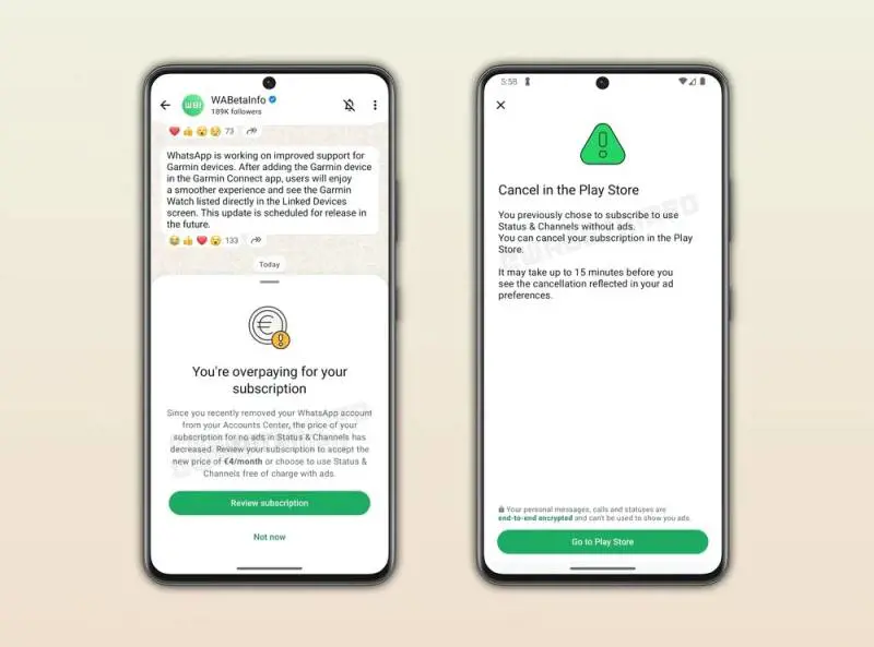 Non è dato sapere al momento neppure se il canone si applicherà a un singolo piano di abbonamento per tutte le app Meta, inclusa WhatsApp, oppure se l'azienda intenda offrire anche un piano separato senza pubblicità specifico per WhatsApp, ovviamente a un prezzo inferiore.Gli utenti potranno gestire il proprio abbonamento al piano senza pubblicità in qualsiasi momento, attivandolo o disdicendolo tramite il Google Play Store, esattamente come accade per gli abbonamenti ad altre app.