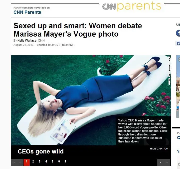 La top manager è apparsa sulle pagine dell'edizione di settembre di Vogue in una foto che subito suscitato molte polemiche. La Mayer appare distesa su un lettino bianco mentre indossa tacchi a spillo con una sorta di borchia alle caviglie e un abito blu di Michael Kors. Il dibattito si infiamma soprattutto tra le donne. Alcune la accusano di giocare con gli stereotipi femminili mentre altre la difendono dicendo che le donne possono essere intelligenti e allo stesso tempo attraenti.