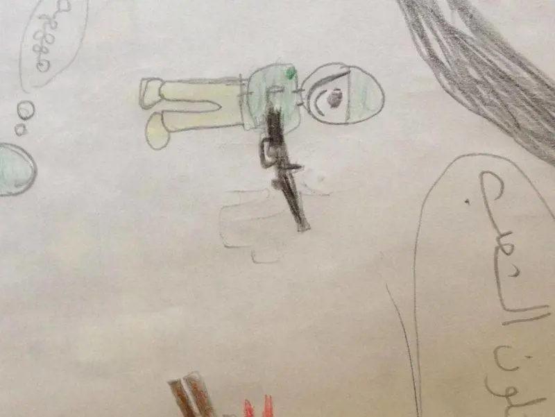 Dopo mesi passati lontano dalle violenze in Siria, gli alunni stanno ritrovando la normalità, raccontano le insegnanti. I primi giorni, però, i disegni erano molto meno innocenti, parlavano di sangue, spari e morte. Le maestre ne hanno tenuti alcuni, per esporli in una piccola mostra. Un bambino ha disegnato quella che sembra essere una manifestazione: i dimostranti gridano Allahu Akbar, Dio è grande, sotto il fuoco di soldati, di un carro armato e di aerei che lanciano bombe. Accanto, c’è scritto: «L'esercito siriano ad Aleppo». In un altro disegno i soldati sparano ridendo (nel fumetto in arabo c’è scritto «ah ah ah»), ci sono morti e sangue per terra. Qualcuno ha disegnato invece due grandi mani e la scritta «libertà». Sono ammanettate. Un altro alunno immagina un prigioniero dietro le sbarre: piange e le lacrime sono a forma di stella, simboli sulla bandiera siriana. C’è chi ha rappresentato il raìs siriano come un gigantesco leone (Assad in arabo significa leone). La bestia sta mangiando un uomo. Il bambino ha scritto: «Sappiamo che sei Assad-leone, ma mangi il tuo popolo». C'è anche l’Esercito libero siriano nei disegni dei bambini.