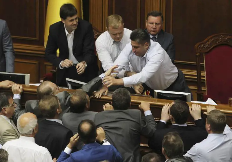 Mentre imperversava il caos lo sponsor del testo, il partito delle Regioni del presidente Viktor Yanukovich, ha proposto di discuterlo in aula nonostante non fosse all'ordine del giorno. Questo ha scatenato una rissa accanto allo scranno della presidenza e dei capigruppo: un corrispondente dell'Afp ha riferito di decine di deputati coinvolti. Il partito della Regioni ha occupato i seggi dei capigruppo e il presidente ha annunciato, a sorpresa, il voto immediato per convertire in legge il testo, già approvato in prima lettura all'inizio di giugno.