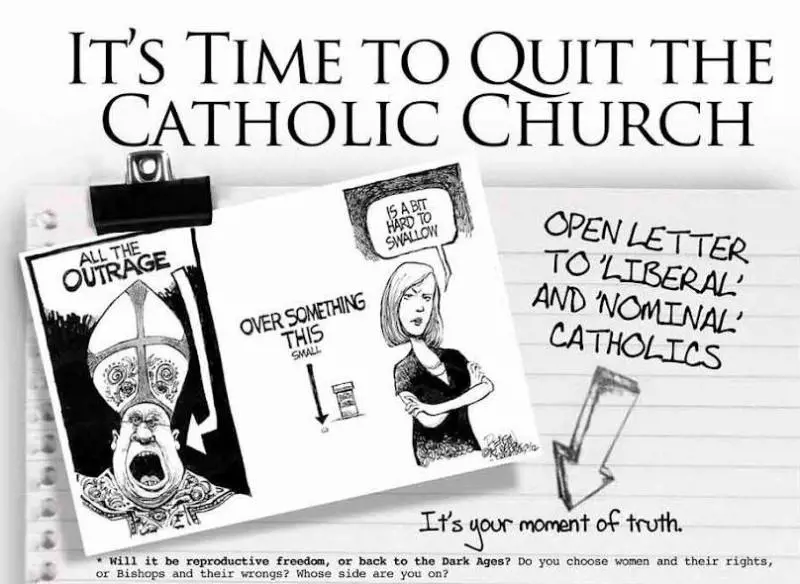 Alcuni giorni fa una bizzarra pagina pubblicitaria appare sul New York Times. Una lettera aperta indirizzata ai cattolici moderati o non praticanti dal titolo che non lascia nulla all'immaginazione: «È tempo di abbandonare la Chiesa Cattolica». Un invito a dire basta all'oscurantismo cattolico e abbandonare la Chiesa, incorniciato tra la vignetta di un vescovo furioso che strilla guardando una pillola anticoncezionale e il disegno di una donna accigliata che reclama la propria libertà sessuale. La lunga lettera rappresenta una sorta di manifesto semplificato del laicismo liberal della sinistra americana, in gran parte centrato sui temi dell'aborto e della politica cattolica sulla contraccezione. Partendo dai diritti delle donne, l'invettiva passa in rassegna tutti i mali del mondo, dalla miseria alla sovrappopolazione, e finisce per attribuirli tutti alle sacre scritture. Ovvia la conclusione: la modernità non è compatibile con la religione. Cari cattolici, è arrivato il tempo delle scelte: abbandonate la Chiesa. A firmare la pubblicità, la fondazione atea Freedom From Religion Foundation.