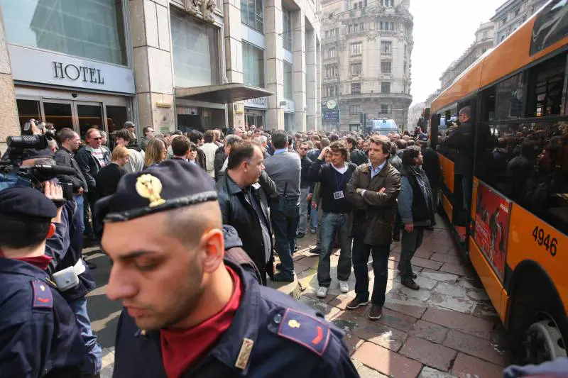 Ore 13 iniziano le grandi manovre davanti all’hotel Cavalieri, sede del convegno organizzato da Fn, con relatori provenienti da Inghilterra, Francia e Cipro. Missori è a dir poco blindata, contingenti presidiano ogni via e vicolo d’accesso alla piazza. Alle 13.30 viene bloccato il traffico: non si passa più, in auto, in tram, neppure a piedi.