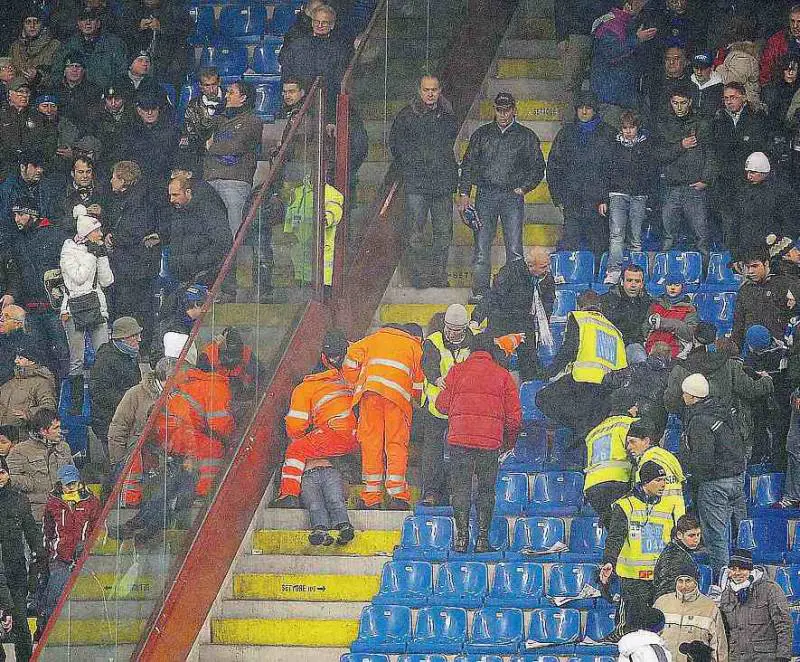 Esulta per il gol negli ultimi minuti della partita sporgendosi dalla ringhiera e cade nel vuoto. Ora è ricoverato in ospedale «in condizioni critiche ma non disperate» il tifoso di 36 anni che ieri pomeriggio, precipitato dal secondo anello di San Siro. Finendo contro un altro spettatore, anche lui ricoverato, anche se il suo quadro clinico desta minori preoccupazioni. È il terzo incidente del genere negli ultimi anni allo stadio: sempre ragazzi e giovani uomini, sempre per una drammatica incoscienza. Nei due casi precedenti i casi le vittime se la sono cavata e, con ogni probabilità, pure in questo caso, il dramma dovrebbe solo essere stato sfiorato.