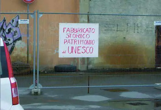 «Fabbricato storico. Patrimonio dellUnesco» è lironico cartello che domenica è stato affisso a Voltri. Il fabbricato in questione è un capannone in via ai Cantieri di Voltri, una costruzione in precarie condizioni che ospita la sede della ditta Puppo Metalli. Il capannone è realizzato con struttura in acciaio, copertura in lamiere, il tutto tenuto insieme in maniera approssimativa, tanto che il vento (che a Voltri non si fa desiderare) potrebbe divellere le strutture con grave pericolo per la strada vicina. Proprio per questo pericolo incombente il 5 marzo scorso il dottor Enrico Vincenzi, dirigente dell Ufficio Pubblica Incolumità di Genova, ha inviato un avviso al legale rappresentante dellAutorità Portuale, dottor Luigi Merlo, alla Prefettura, al Presidente del Municipio, al VII distretto della Polizia Municipale. E tutto ciò perché si provvedesse con urgenza, tempo 15 giorni, a fare interventi di manutenzione, consolidamento e ristrutturazione necessari. Malgrado tutto lo zelo dimostrato dal dirigente Vincenzi, però, non si è realizzato un bel niente ed è per questo che qualcuno, domenica scorsa, mentre la ditta era chiusa per riposo, ha avuto la pensata del cartello.
