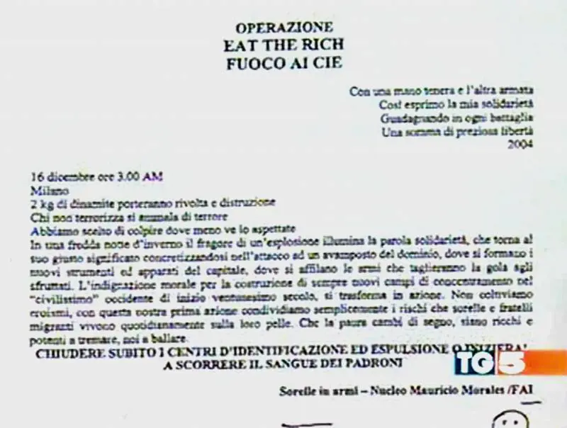 È un documento che va letto con attenzione, perché riassume bene la cosmologia di questo universo, l’analisi che porta a giustificare la risposta violenta. Il sostanziale fallimento della sinistra antagonista nei suoi tentativi di reclutare forze tra gli immigrati o tra i lavoratori a rischio del posto, non ha fatto che spingere queste sedicenti avanguardie verso la radicalizzazione.