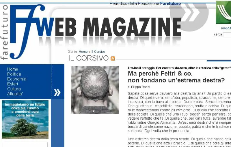 Un caudillo detta la linea "Quel che non si capisce, però, onestamente - conclude Ffwebmagazine - è come sia possibile che leader politici di lungo corso e di tradizione consolidata come, giusto per fare qualche nome, Giulio Tremonti, Claudio Scajola, Franco Frattini, accettino ancora tutto questo. Accettino senza fiatare che un caudillo detti la linea di un grande partito europeo. Accettino di mandare al macero una possibilità, un'opportunità storica: quella di costruire, finalmente, anche in Italia, una destra sana, colta, moderata. Come loro. Una destra capace di parlare al paese, a tutto il paese. E non solo a una rumorosa minoranza di incazzati".