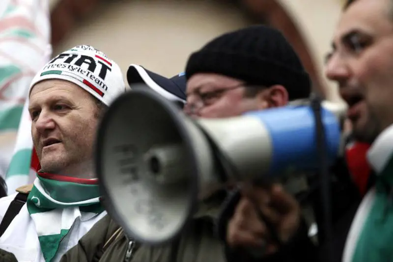Operai in piazza Presidio dei lavoratori davanti al parlamento in occasione della riunione a Palazzo Chigi dove l’azienda, con l’ad Sergio Marchionne, incontra il governo e le organizzazioni sindacali per presentare il piano industriale per l’Italia. Un gruppo di lavoratori, soprattutto di Termini Imerese e Pomigliano, ha piazzato striscioni nel fondo della piazza e ha già intonato canti e slogan di protesta. "Duemilacinquecento famiglie senza lavoro: non lo permetteremo" recita uno striscione dei lavoratori di Termini che, spiegano: "Se oggi Marchionne è qui è grazie alla lotta che Termini ha fatto nel 2002". "Non è vero che le auto a Termini costano mille euro in più" affermano altri lavoratori mentre un altro gruppo, sulle note della Tarantella, grida "Pomigliano non si tocca".