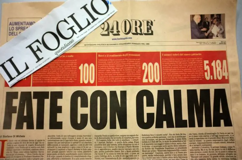 Ecco dunque che il Foglio di Giuliano Ferrara ha deciso di rompere il silenzio e, con una finta prima pagina del Sole 24Ore, ha titolato a caratteri cubitali: "Fate con calma". In alto, sopra al titolo, una striscia rossa con dei numeri significativi. Tra questi ce n'è uno, 5.184, che indica le ore intercorse tra il giuramento del governo e domani. Poi si legge un commento, con una punta di acida ironia: "E' nato così in fretta il sobrio gabinetto che ci ha spiazzato, viziato e il paese soffre d'astinenza grave.