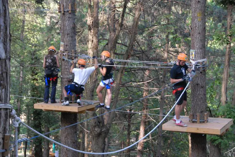 Percorsi Gli aspiranti Harrison Ford possono cimentarsi attraverso quattordici ettari di bosco, perfettamente curato, per affrontare 9 percorsi di difficoltà variabile. Il dislivello altimetrico che il parco presenta ha consentito l’installazione di piattaforme di partenza – arrivo, di liane, ponti sospesi e travi ad altezze diverse, consentendo percorsi avventura che vanno dal metro mezzo di altezza per i bambini, agli oltre 20 metri per chi ama le emozioni forti e robuste scariche adrenaliniche. I percorsi, come avviene per le piste da sci, sono indicati con colorazioni diverse. Si va dal verde, che indica l’impegno più semplice, al nero quello che richiede una buona preparazione fisica e nervi saldi.