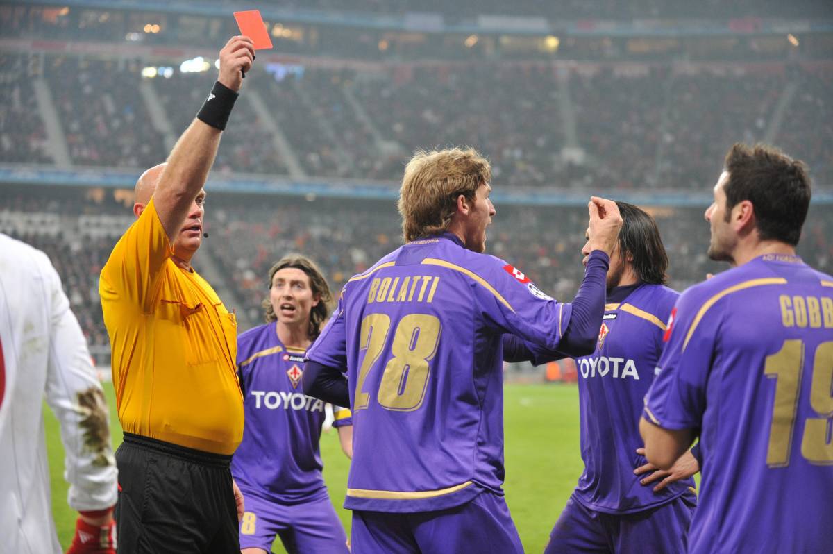 Monaco - Rapina a mano armata. La Fiorentina se ne va dall'Allianz Arena con la consapevolezza di poter passare il turno al ritorno, ma anche con una rabbia difficile da smaltire. Partita vera, bella vibrante e corretta fino al 28' della ripresa. Segna prima il Bayern Monaco, con un rigore di Robben nel recupero di primo tempo. Pareggia la Fiorentina in avvio di ripresa con un colpo in mischia di Kroldrup. Al 28' del secondo tempo al cedtro della scena si catapulta l'arbitro. Il norvegese Ovrebo, conosciuto in Italia e anche oltreconfine. Era lui il direttore di gara che annullò il gol regolare di Luca Toni agli Europei contro la Romania. Sempre lui l'arbitro che l'anno scorso fece infuriare il Chelsea nella semifinale di ritorno vinta dal Barcellona: tra rigori negati e falli non sanzionati. Diciassette minuti segnati da un scelta più sbagliata dell'altra che indirizzano la partita nelle mani dei bavaresi. Prima l'espulsione di Gobbi per un'ostruzione su Robben: al massimo poteva starci un giallo. Poi l'ammonizione a Klose per un intervento a piedi uniti sulla gamba di Kroldrup dopo un rinvio: era da rosso diretta. E a un minuto dalla fine il capolavoro. Gol di Klose convalidato quando l'attaccante tedesco era due metri in fuorigio sull'assist di testa di Olic. Frittata completa sotto gli occhi del presidente della Uefa Michel Platini in tribuna. Incredulità sulle facce di giocatori e dirigenti viola: la strada per i quarti di finale si fa tortuosa. E invece si poteva riprendere l'aereo per Firenze con un rassicurante 1-1 al caldo nella giacca.