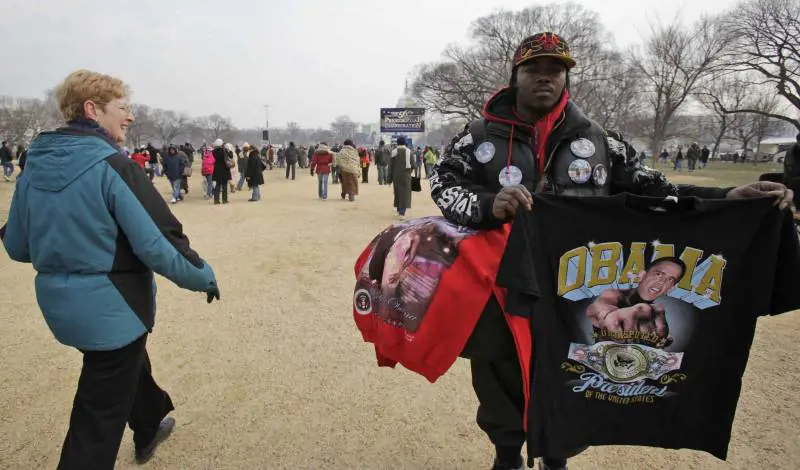 Magliette con la scritta "I Was There" (io c’ero), il cui prezzo varia dai 10 ai 40 dollari a seconda che si voglia la scritta che brilla di strass oppure no; orologi presidenziali per coppie, nel senso che vengono venduti in confezioni da due, uno per donna con il volto-quadrante di Michelle Obama, uno per uomo con il volto-quadrante del marito; quadri-foto di Obama già dotati di apposito portacandele, per trasformare le pareti di casa in altrettanti altarini dedicati al nuovo presidente (prezzi alti, dai 100 dollari in su, ma "trattabili").