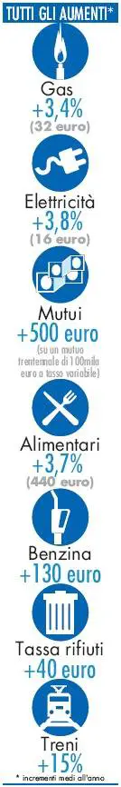 Il caro consumi colpirà duramente nel 2008. Secondo uno studio dell’Unione consumatori infatti per le famiglie si propone una stangata che porterà a spendere, a causa degli aumenti di generi alimentari, mutui, benzina, autostrade, treni, gas, elettricità, bolli per auto e moto e pure il canone Rai, almeno1.700 euro in più all’anno. Una bella cifra, insomma, se si considera oltretutto che il governo Prodi ha alzato ormai da un anno le aliquote contributive considerando «ricco» anche chi guadagna 40mila euro, lordi naturalmente. Anche nel 2009 si prevedono già nuovi aumenti che porteranno la stangata dei rincari a far spendere ben 2.500 euro in più a famiglia rispetto all’anno appena concluso. Ma vediamo gli aumenti nel dettaglio.