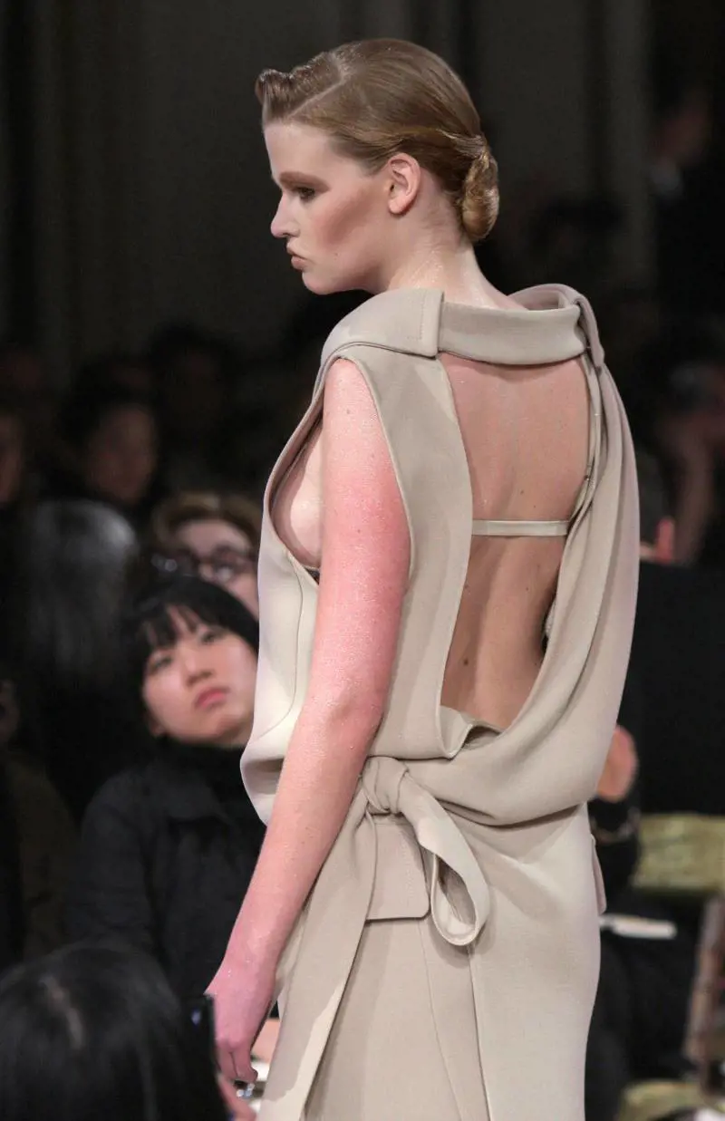 Anche Marc Jacobs lavora su seduzione e borghesia, un binomio che riserva sempre molte sorprese come dimostrano film tipo Belle de Jour di Louis Buñuel oppure Gruppo di famiglia in un interno del nostro Visconti. Così sulla passerella di Louis Vuitton si materializza un organismo geneticamente modificato tra Maria Antonietta e una ballerina di can can senza dimenticare qualcosa di Inès de la Fressange e di Loulou de la Falaise, un tocco da rockstar che non guasta mai per non parlare delle conigliette di Playboy evocate dall’acconciatura a grosse orecchie in malizioso satin nero.
