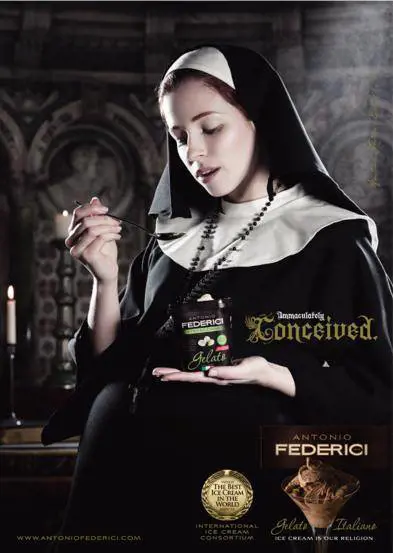 Londra - Non è la prima volta che la pubblicità provoca con immagini di religiosi. Dopo la campagna Benetton firmata Oliviero Toscani di qualche anno fa, ora al centro dello scandalo è la Antonio Federici. Negli spot della marca di gelati italiani molto amata in Gran Bretagna, una giovane suora incinta mangia voluttuosamente un gelato in chiesa. La foto è corredata dalla scritta "Concepita immacolatamente".