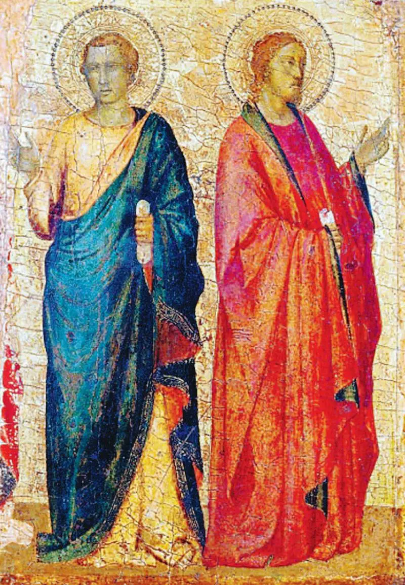 Fra i pittori rappresentati, c’è Giotto con Due Apostoli della Fondazione Cini di Venezia, riferiti per la prima volta alla sua bottega, e il polittico raffigurante Cristo benedicente e santi, dipinto per la cappella Peruzzi in Santa Croce di Firenze, smembrato, ricomposto nel 1947, giunto adesso dal North Carolina Museum di Raleigh (Usa). Sono le opere della maturità dell’artista a lasciare tracce sugli allievi, che ne danno originali interpretazioni sviluppando spazialità, volume, colore, realismo. Bernardo Daddi, ad esempio, riprende gli aspetti più poetici, mescolandoli alla linearità senese nella preziosa Caterina d’Alessandria, dipinta nel laterale di un polittico fra il 1335 e il 1340. Taddeo Gaddi, stretto collaboratore di Giotto e suo «erede ufficiale», usa schemi e motivi iconografici del maestro, variandoli con fantasia nell’Annunciazione del ricostruito polittico di Santa Maria della Croce al Tempio. Maso di Banco sceglie la solennità del grande caposcuola traducendola con grazia nella Madonna e santi del bel polittico della chiesa fiorentina di Santo Spirito.