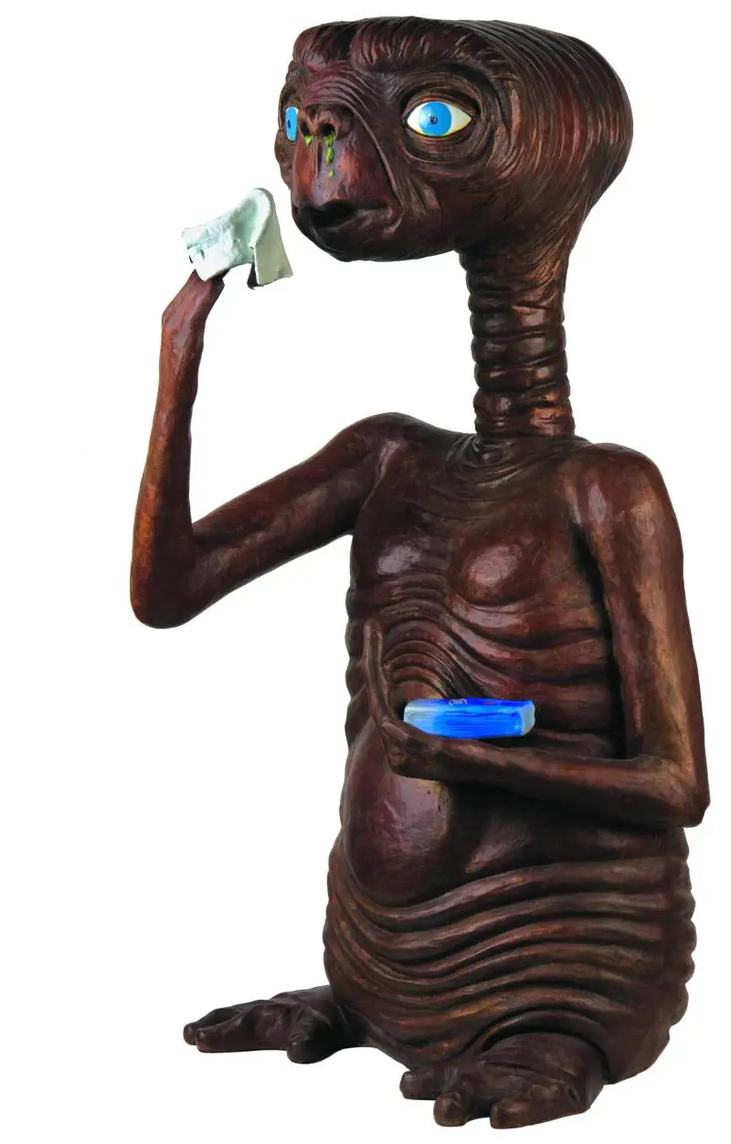 Lo sta facendo in questi giorni il milanese Francesco De Molfetta alla The Don Gallery nella mostra «New Idols» (in via Cola Montano 15, fino al 25 aprile, ingresso libero). Nella galleria dell'Isola che è solita prestare attenzione alle espressioni meno commerciali dell'arte contemporanea, trova ora spazio l'estro di un giovane (classe 1979) che ci restituisce i miti degli anni Ottanta opportunamente rivisitati e corretti in chiave contemporanea. ET anziché alzare il dito per chiamare casa si soffia il naso e si trasforma in una statua bronzea dall'aria goffa e impacciata dal titolo «Etcì». Batman ci accoglie all'ingresso della mostra, ma è talmente grasso che non riesce a volare e preferisce mangiarsi un cono gelato: diventa così «Fatman», letteralmente, l'uomo grasso. Gli anni Ottanta furono il periodo d'oro dei cartoni animati giapponesi, del «dolce forno Harbert», del pallone Supertele, di «Arnold», «Chips» e «Hazard», di Wonder Woman e MacGyver, del ping pong e del cubo di Rubik, tornato peraltro in auge dopo la sua ricomparsa sul grande schermo nel film «La ricerca della felicità» di Gabriele Muccino. In mostra, rielaborati sottoforma di sculture, troviamo tanti di questi miti, come una rappresentazione di King Kong che non fa paura a nessuno perché preferisce mangiarsi una banana piuttosto che spaventare la bionda Jessica Lange che giace ai suoi piedi.