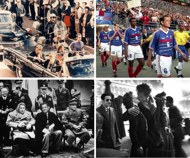 Veniamo a giorni più recenti: nei favolosi anni ’60 Nicolas crea i «Fab five», insomma è il quinto Beatle e in un’istantanea si fa immortalare accanto a John Lennon e George Harrison, non spiegando tuttavia quale sia il suo strumento musicale. Eccolo poi, pochi mesi prima di Berlino, il cinque giugno del millenovecentoottantanove in piazza Tienanmen, è lui il ragazzo che si piazza davanti ai carri armati del partito comunista, la fotografia fa il giro del mondo, Sarkò si volta appena per un sorriso. Il mondo ho detto? E perché no un mondiale, di calcio meglio, addirittura la finale, Parigi, Stade de France, dodici luglio del 1998, entra sul terreno di gioco con la maglietta numero 6, sottratta a Djorkaeff, è seguito da Desailly, Zidane e Petit, poi sarà lui a baciare la coppa d’oro.