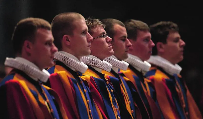 Il 6 maggio 1527, data del Sacco di Roma, si lega profondamente con la storia della Chiesa, anche perché è stata segnata dal sangue di 147 suoi figli: le guardie svizzere che morirono sui gradini dellaltare maggiore di San Pietro, nel tentativo di difendere Clemente VII da Lanzichenecchi e mercenari spagnoli. E proprio ogni anno, in questo giorno, nel corso di una suggestiva cerimonia le nuove reclute fanno solennemente il loro giuramento nel cortile di San Damaso del Palazzo Apostolico. Ogni alabardiere tiene stretta nella mano sinistra la bandiera dai colori giallo, rosso e blu, divisi dalla croce bianca, sulla quale spicca larme del comandante del corpo in carica, accompagnata dagli stemmi del Papa regnante e di Giulio II. Gli Svizzeri sono in uniforme di gala disegnata secondo tradizione da Michelangelo e caratterizzata dalle losanghe gialle e blu con risvolti rossi dal vistoso morione di foggia spagnola sormontato da rosse piume di struzzo, dalla gorgiera, la corazza e lalabarda di due metri, pesante ben sei chili. Come sempre alla cerimonia, accompagnata dal suono dei tamburi della banda, partecipano personalità religiose del Vaticano, rappresentanti politici e militari della Confederazione Svizzera, il tutto coronato da un centinaio di persone tra parenti e amici. Il cappellano del Corpo legge il testo del giuramento, con il quale ciascuno si impegna a «servire fedelmente, lealmente e onorevolmente il Sommo Pontefice». Poi le nuove reclute, chiamate per nome, si fanno avanti e ciascuna - con la mano sinistra sulla bandiera del Corpo e la destra alzata con tre dita aperte nel segno della Trinità - giura.