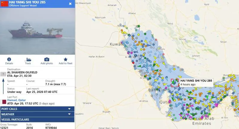 Chinese surveillance ship Hai Yang Shi You (285) got underway in the Gulf again, just before the ceasefire was set to expire. The dual-use survey ship, with close ties to the PLA, rode out the ceasefire at port in Qatar, ~10 miles from U.S. assets forward-deployed at Al Udeid AB. pic.twitter.com/krirNNa0uL