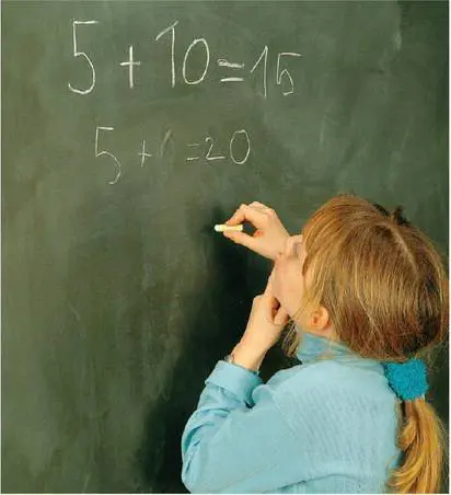 Una signora organizza una caccia al tesoro per un gruppo di bambini nascondendo dei cartoncini verdi, rossi e gialli. I verdi valgono 1, i rossi 2 e i gialli 3. Lo scopo del gioco consiste nel conseguire il massimo punteggio, trovando i cartoncini e sommando il loro valore. Una bambina osserva seria: «Questo gioco non si può fare». «Perché mai?», chiede la signora. «Perché non ci sono il segno “più” e il segno “uguale”. Le addizioni si fanno soltanto sul foglio col segno “più” e il segno “uguale”».