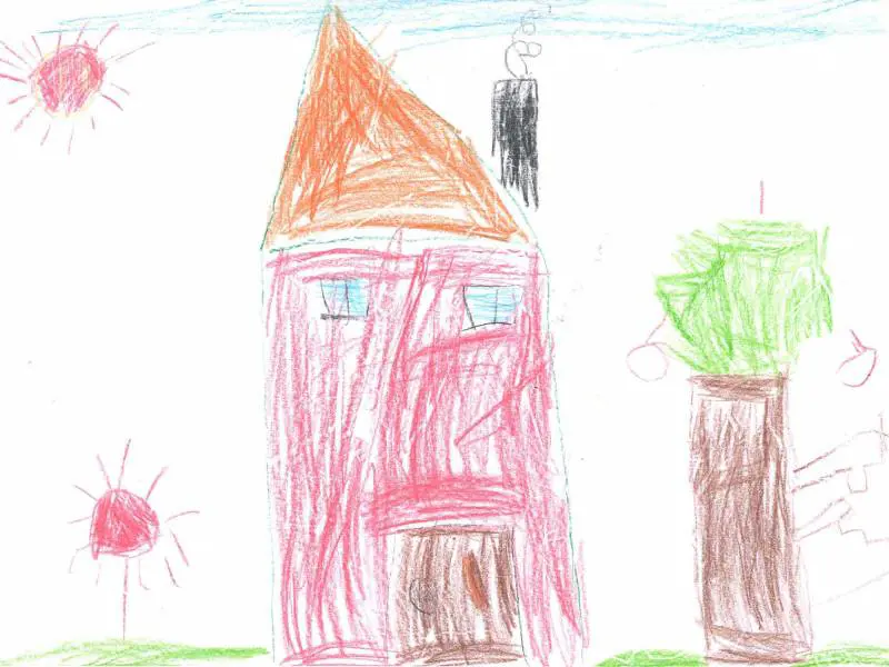 Anche la casa presenta qualche segnale di conflitto con quel comignolo nero, quella porta sbarrata e quelle finestre chiuse: sono tutti segnali che anche in casa non c'è una vera serenità o meglio egli la percepisce come causa della sua tensione. Inutile dire che egli sta vivendo la gelosia per la sorellina che, quando deve andare all'asilo, ha l'opportunità di starsene comodamente a casa accudita dalla mamma.