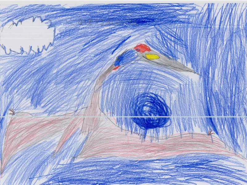 Lo scarabocchio, molto colorato d'azzurro e con una nuvola bianca posta alla sinistra del foglio, mette in evidenza che il piccolo sta vivendo momenti emotivi legati anche alla sua età. Per essere più esaustiva, soprattutto per quanto riguarda la disgrafia, sarebbe necessario avere due righe della sua scrittura anche per valutare una possibile incipiente disgrafia.
