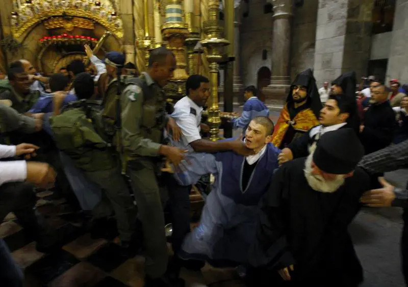 Gerusalemme - Se le sono suonate di santa ragione. Come sempre quando il ring è il Santo Sepolcro e a darsele arrivano bande di monaci scalmanati. Va così da secoli, da quando 1300 anni fa, cattolici e siro-ortodossi, copti ed etiopi, armeni e greco-ortodossi iniziarono a bastonarsi per il controllo di tabernacoli, colonne, e sagrestie disseminati tra il marmo del Santo Sepolcro e l’altare del Golgota. Ieri l’immortale zuffa si è riaccesa. La data era di quelle fatidiche. Alla chiesa del Santo Sepolcro gli armeni celebravano il 400º anniversario del ritrovamento della Croce di Gesù Cristo e, come sempre da 400 anni, gli altri «fratelli» eran già in trincea.
