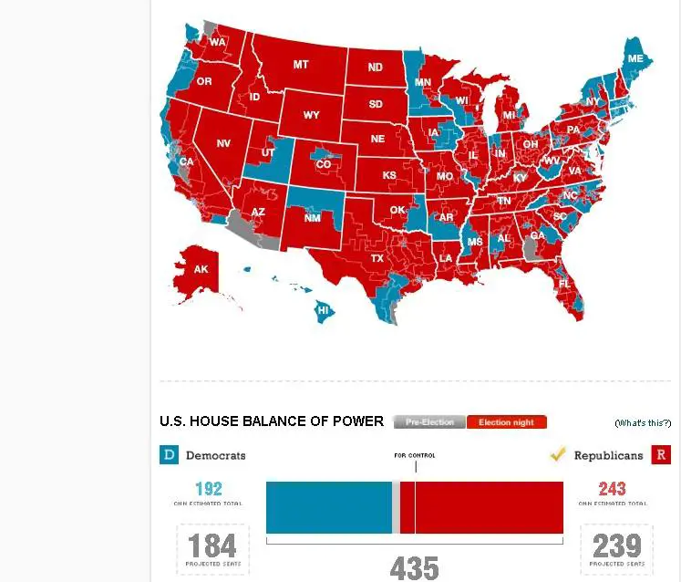 Washington - Una "marea rossa" negli Stati Uniti: non è l'invasione dei comunisti ma l'avanzata a valanga dei repubblicani (i democratici sono indicati dal colore blu), che hanno vinto le elezioni di midterm. Al Gop (Grand Old Party) va il controllo della Camera dei rappresentanti (243 deputati contro 192, la maggioranza è 218), mentre il Senato resta in mano ai democratici (51 contro 47).