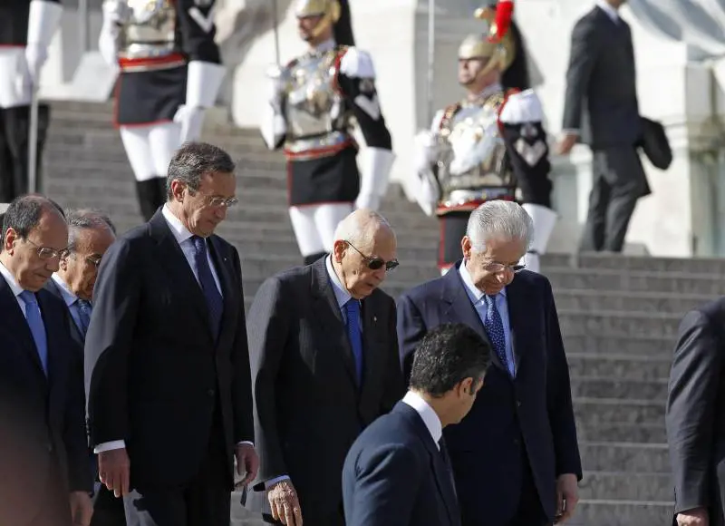 In precedenza il presidente della Repubblica, Giorgio Napolitano, ha deposto una corona d'alloro davanti alla tomba del Milite Ignoto al Vittoriano. All'arrivo Napolitano è stato salutato dai picchetti d'onore dei Carabinieri, della Marina, dell'Esercito, dell'Aeronautica e della Guardia di Finanza. Schierati ai lati della scalinata del Vittoriano in alta uniforme i corazzieri.