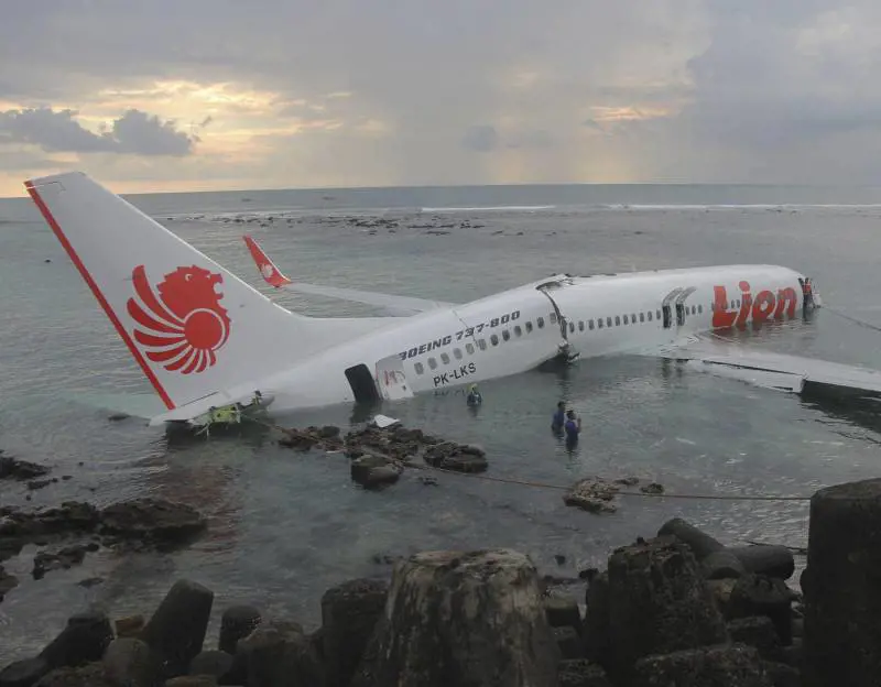 Un aereo della compagnia indonesiana Lion Air con 108 persone a bordo, partito da Bandung (ovest di Giava) e diretto a Bali, ha mancato la pista d'atterraggio ed è finito nell'oceano, spezzandosi in due tronconi. Miracolosamente, tutte le persone a bordo si sono salvate e «solo» 40 sono state ricoverate in ospedale per varie fratture, ferite alla testa e forte stato di choc. Secondo quanto riferiscono vari media, il velivolo con 101 passeggeri e 7 membri d'equipaggio era decollato da Palu, (sull'isola di Sulawesi) per dirigersi prima a Banjarmasin (capitale dell'isola indonesiana di Kalimantan), quindi verso Bandung. Come tappa finale doveva atterrare a Bali ma, per motivi ancora da accertare, il pilota ha mancato la pista d'atterraggio per 50 metri ed è finito direttamente nelle acque dell'Oceano Indiano. Le foto del velivolo, (un Boeing 737-800 in uso dalla compagnia indonesiana dallo scorso marzo, coperto dall'acqua e spezzato in due), hanno immediatamente fatto il giro del web, così come le immagini dei passeggeri con indosso i salvagente che si dirigono a nuoto verso i gommoni dei soccorritori.