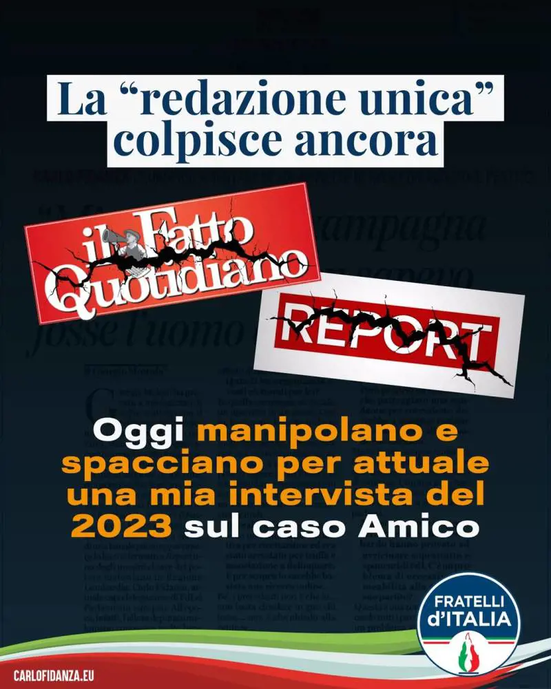 Come spesso avviene, però, l’intervista, trasmessa il 14 gennaio 2024, venne tagliata e “di quei 7 minuti - dice Fidanza - rimasero soltanto pochi secondi”. L’eurodeputato meloniano, quindi, attacca: “E, siccome il lupo perde il pelo ma non il vizio, anche nella cosiddetta intervista di allora, pubblicata oggi e spacciata come attuale, quei 7 minuti del 2023 vengono tagliati e cuciti su misura, omettendo parti molto significative". In quell'intervista, spiega Fidanza, "già chiarivo che Amico mi si era presentato come referente del movimento Grande Nord, che all'epoca non era indagato per fatti di mafia e che non aveva mai ottenuto ruoli o favori da me né da FdI”. L’esponente meloniano chiosa: "Evidentemente pensano che questa manipolazione possa servire per confermare i loro assurdi teoremi su inesistenti contiguità con le mafie. Lascio a voi, e magari anche all'Ordine dei Giornalisti, giudicare correttezza e credibilità della 'redazione unica'.