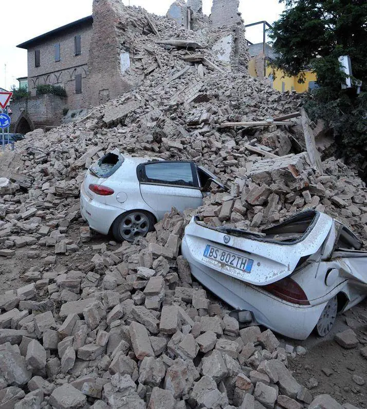 La gente ha udito un sinistro boato. Poi i crolli: campanili mozzati, capannoni agricoli sventrati, le pareti esterne delle chiese sbrecciate, calcinacci dietro ogni angolo. Gli edifici storici scoperchiati. Le strade secondarie crepate e i ponti sul canale Cavo Napoleonico pericolanti. E poi le auto parcheggiate in strada con i sedili reclinati, i finestrini appannati, i bagagliai rigurgitanti di cose ammassate in fretta. I campi di calcio trasformati in tendopoli. I capannelli di persone incredule vestite in qualche modo. Le famiglie di magrebini con gli occhi ancora pieni di paura davanti a uno spettacolo mai visto. Gli ospedali svuotati, i malati spinti sui marciapiedi nelle lettighe o in sedia a rotelle sotto una pioggia che per tutto il giorno non ha dato tregua.