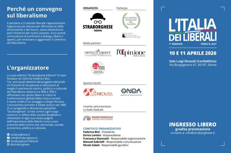 "L'Italia dei liberali verso il 2027" è il titolo del convegno in programma a Roma il 10 e 11 aprile, organizzato dall’editore e giornalista liberale Federico Bini (fondatore della casa editrice Straborghese Edizioni) in collaborazione con l’Academy Spadolini del Talento, presieduta dal professor Luigi Tivelli e con la partnership di Confedilizia, “Critica e Libertà”, “L’Opinione” e Onda – Agenzia di Comunicazione.