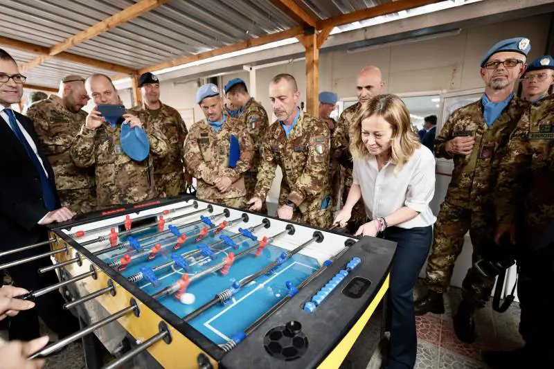 Dopo gli impegni istituzionali e le parole di apprezzamento rivolte ai nostri soldati ("L'Italia vi è grata. Sono qui soprattutto a dire grazie a nome dell'Italia per aver scelto di indossare la divisa"), Meloni si è concessa un momento decisamente più informale con i militari impegnati nel Paese mediorientale. Nelle imagini catturate da Crosetto si vede il premier impugnare le aste del biliardino che muovono rispettivamente la difesa e il portiere. "Attenzione, match point", esclama una voce fuori campo, a sottolineare la solennità (chiaramente giocosa) del momento. La palla corre così sul biliardino, tra colpi e stop. Per un attimo tutti restano con lo sguardo fisso sulla partita in corso.