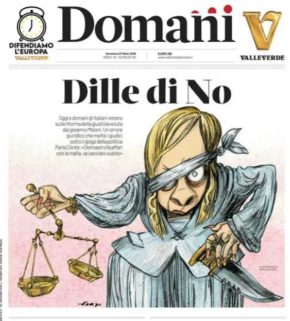 Alla fine ce l’hanno fatta: guardate la prima pagina di oggi del Domani e capite che, per loro, il voto sulla giustizia è solo politico. Si vede una caricatura della Meloni con sopra la scritta “Dille di no”. In sostanza la prima pagina esprime questo concetto: non importa se questa riforma serve o meno alla giustizia, l’unica cosa che conta è mandare a casa Meloni. Patetici.