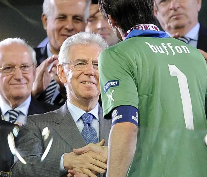 Roma - Una cosa è certa, il coraggio non gli è mancato. Per Mario Monti presentarsi in tribuna a Kiev a «godersi» la disfatta azzurra nella finale di Euro 2012 contro la Spagna, indossando suo malgrado lo scurissimo abito da capro espiatorio per il flop più doloroso, non dev’essere stato facile. L’unica speranza per il Professore, il cui feeling col pianeta calcio è scarsino, era una vittoria di Buffon e compagni. Il trionfo gli avrebbe donato un’aura apotropaica, ma la partita s’è messa subito malissimo. E il malcapitato professore, pur non avendo marcato lo sgusciante Fabregas (quello era Chiellini), è finito lo stesso al centro degli strali di mezza nazione, sbeffeggiato sui social network e additato come responsabile della disfatta. Più di Prandelli, Cassano e Balotelli. Non canta l’inno e non va bene. Ride diplomatico tra le autorità dopo le quattro pere spagnole e va pure peggio. Parla con la Rai dopo il novantesimo e manda i tifosi azzurri in bestia.