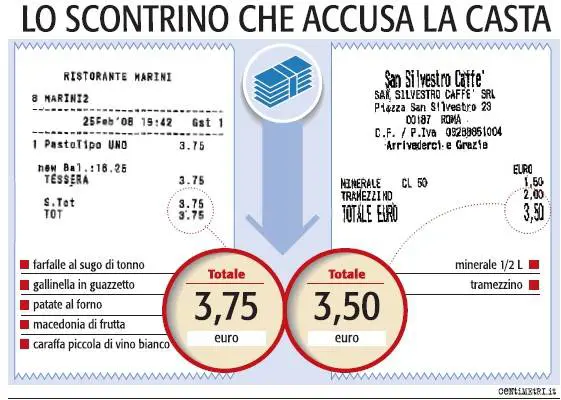 Roma - Trentasei passi di marciapiede nel cuore di Roma sono lo spartiacque tra lo spuntino povero dell’uomo qualsiasi e il pranzo a quattro portate dell’uomo di palazzo. Lo scontrino appesantito dall’inflazione e quello alleggerito dal contributo pubblico. Tre euro e cinquanta per tramezzino e mezza bottiglia di acqua naturale sul conto dell’uomo qualsiasi, al bar. Tre euro e settantacinque per farfalle al sugo di tonno, gallinella in guazzetto, patate al forno, macedonia e un quartino di vino bianco nella pancia dell’uomo di palazzo, alla mensa della Camera. Trenta metri, stessa piazza: San Silvestro. È il marciapiede del doppio scontrino, la città a due prezzi. Il Paese a due prezzi.