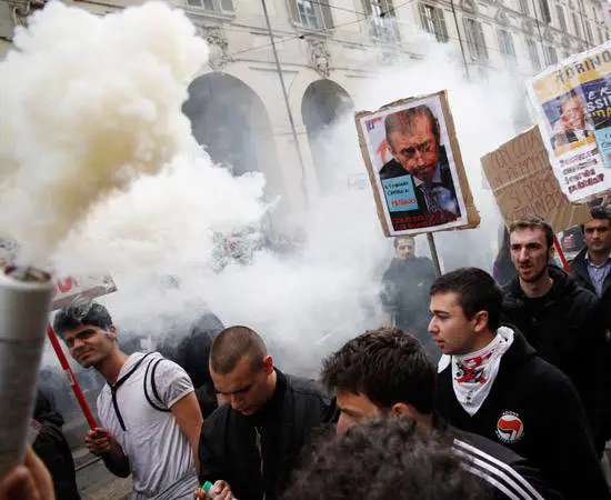Nel pomeriggio la situazione è degenerata, un gruppo di quattrocento antagonisti si è staccato dal corteo per dirigersi verso il palazzo comunale. Qui, alcuni no attivisti Tav hanno montato una scala su un furgone e sono saliti su un balcone dove hanno attaccato uno strisdcione con scritto "Liberi tutti". Subito dopo le forze dell'ordine hanno sgomberato i manifestanti. Tensione anche durante il corteo, quando alcuni ragazzi dei centro sociali hanno aggredito a calci e pugni dei militanti del Partito Democratico.