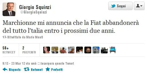 L'ultimo della serie è Giorgio Squinzi, neo presidente designato di Confindustra. Questa mattina ha twittato: "Marchionne mi annuncia che la Fiat abbandonerà del tutto l'Italia entro i prossimi due anni". Peccato che il suo profilo fosse online da appena 15 ore e soprattutto che la sua descrizione avesse lo stesso stile di quella del falso Monti.