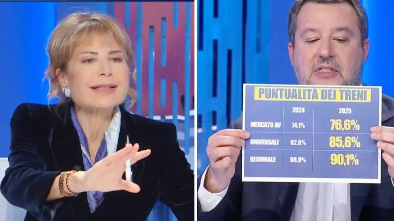 - A un certo punto, ad esempio, lei sostiene una roba del genere: che 9,5 treni su 10 sono in ritardo (ma che dato è??). Lui contesta, tira fuori un numero ben diverso, lei sventola un foglio che direbbe il contrario. Salvini a quel punto ci sta e le dice: vediamoli bene. E lei? La giornalista, cioè quella che dovrebbe fare del dato di fatto la base del proprio mestiere, cosa s’inventa? La seguente uscita: glieli do dopo. A puntata finita, capito? Quando sarà inutile. Ripeto: contenti voi di avere questi maestri, contenti tutti…